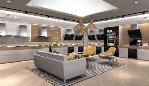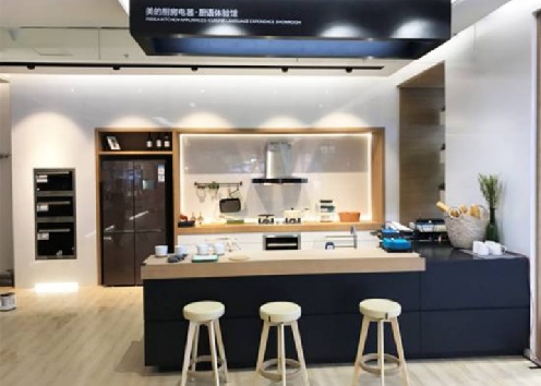 2016年6月,美的廚電全國首家200平米的“廚語”體驗館在武漢問世。走進廚語體驗館,醒目的并不是一字排開的電器柜臺和碩大的特價標牌,而是沙發、冷餐、飲食文化墻,大吧臺大餐桌,嵌入式烤箱,會自己洗的吸油煙機,還有一個個系上圍裙就能做飯的真實廚房操作臺。