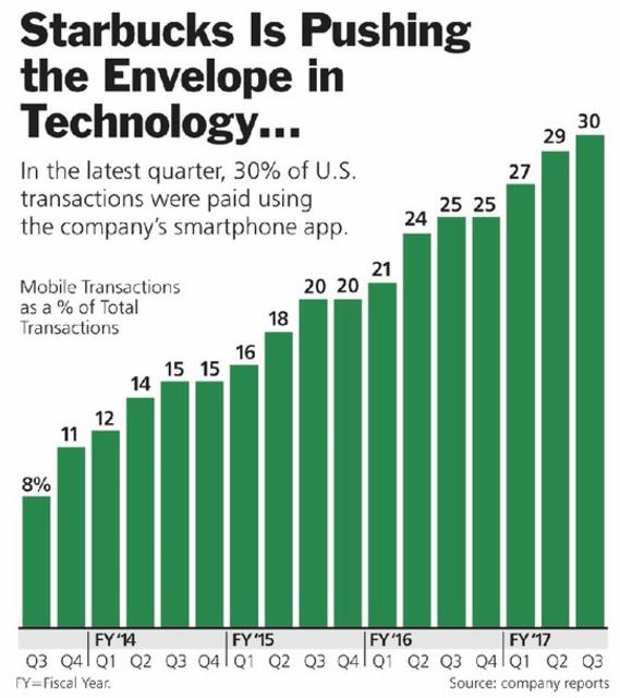 星巴克清楚認(rèn)識(shí)到智能手機(jī)普及給零售業(yè)務(wù)帶來(lái)的機(jī)遇。高層Matthew Ryan 表示,線上服務(wù)帶來(lái)的營(yíng)收成長(zhǎng)和財(cái)務(wù)表現(xiàn)會(huì)讓看空星巴克的投資者失望,電子商務(wù)系統(tǒng)能讓星巴克門市在線下零售店被線上服務(wù)沖擊的大環(huán)境下脫穎而出,不會(huì)像其他公司那樣等著Amazon 搶走自己的業(yè)務(wù)。