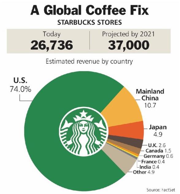 星巴克計(jì)劃在 2021 年將全球門市數(shù)量提升到 3.7 萬(wàn)家,比目前的門市數(shù)量增加 1 萬(wàn)家,大約有四成的新店開設(shè)在美國(guó),亞太地區(qū)將新開 5,000 家門市,在這市場(chǎng)星巴克的營(yíng)收成長(zhǎng)率高達(dá) 70%。