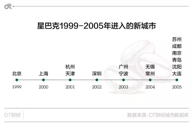 2005年之前,星巴克進入新城市的動作非常保守,每年在單個城市新開的店面數不會超過個位數。這一階段,入駐城市的順序就很值得咀嚼,這包含了星巴克在十幾年前對一個城市商業文化、接受新事物程度的判斷。