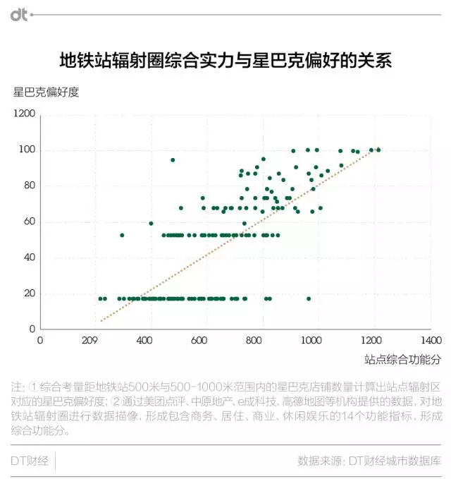 為了方便說明與理解,DT君在接下來的分析中以地鐵站點作為觀察坐標,來指代城市中具體的區域位置:一方面,在地鐵成為路網重要節點的一線城市中,地鐵站點輻射圈差不多能覆蓋全部重點區域;倒過來看,地鐵輻射圈也確實包含了絕大多數的星巴克店鋪,分析它們足夠說明問題。