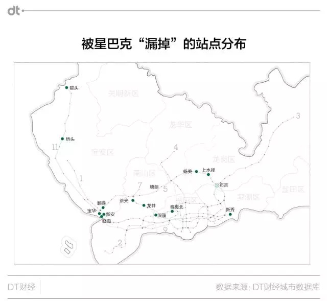 當然,并非修起地鐵站便能迎來一片繁榮,同時獲得星巴克偏愛。畢竟,深圳全城165個地鐵站中,還有近一半地鐵站沒被星巴克選中。這些站之間有什么不同?滿足交通樞紐的條件后,還要怎么才能獲得商業力量恩寵?