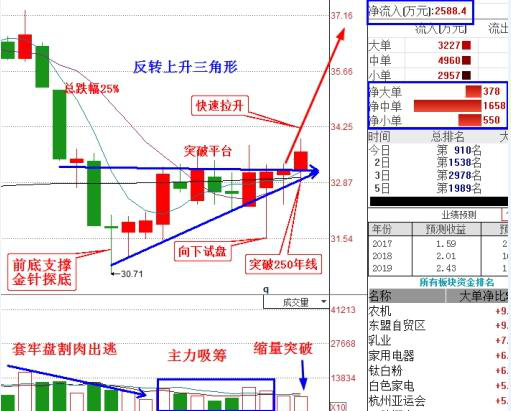 股價從高位超跌25%,在底部形成上升三角形反轉形態(tài)。其中,在下跌是持續(xù)縮量。說明大量套牢盤割肉出局。在最低價30.71受到前期低點支撐,形成金針探底企穩(wěn)形態(tài)。之后陰陽交替上漲,底部不斷抬高,說明有主力在邊建倉邊洗盤。近日縮量突破三角形平臺,不是假突破就是主力高度控盤拉升。我們從股價突破250年線和macd和Kdj金叉偏多看出,該股是主力高度控盤拉升,形成上漲趨勢。現(xiàn)在上漲空間已經(jīng)打開,拉升階段開始。對于這只股票的后期走勢及分析,本人也會在朋友圈中發(fā)布出來,想學習這種選股思路的朋友,可能到本人的朋友圈中去查閱!