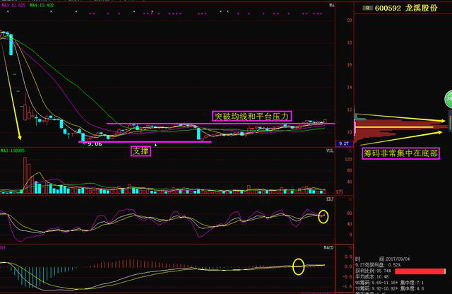 龍溪股份(600592)這股也是跟北京君正一個(gè)類型的個(gè)股,都是在前面出現(xiàn)大幅的下跌后在底部止跌企穩(wěn)的個(gè)股,在底部股形成雙支撐后開始出現(xiàn)反彈的走勢(shì),在近期底部持續(xù)的橫盤震蕩過后現(xiàn)在終于突破了平臺(tái)和均線的壓力進(jìn)入到主升浪的階段,而且MADC+KDJ都是金叉買點(diǎn)的區(qū)域加上籌碼堆來看也是非常的集中在底部的個(gè)股,這類的股票在近期一旦放量就會(huì)啟動(dòng)主升浪,可重點(diǎn)關(guān)注!