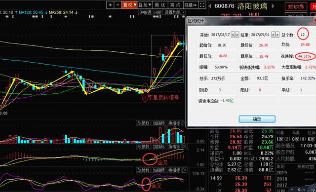上圖的洛陽玻璃600876是本人用三步抓妖戰(zhàn)法選出,走勢上來看此股前期一直處于上升回檔的走勢,在回踩下來之后震蕩調(diào)整20個周期左右的時間后走出了十字星的反轉(zhuǎn)信號,在8.17日更是放量大漲站上多條均線,下方的資金也開始逐步金叉,MACD,KDJ指標(biāo)呈現(xiàn)金叉買入的信號,截止目前短短的12個周期的時間也是收獲了44.51%的漲幅。這樣的股票牛不牛呢?我相信是非常牛的,只要你是本人朋友圈的粉絲,就能夠?qū)W會這套選股方案,也可以自己選出這種牛股。