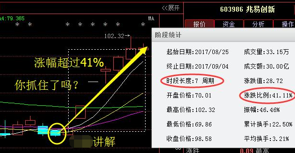 兆易創(chuàng)新隸屬高送轉(zhuǎn),前期股價經(jīng)過一波上漲后,股價出現(xiàn)了長時間的橫盤震蕩,主力資金持續(xù)流入,很典型的莊家在吸籌洗盤。在8月25號果斷用方法在朋友圈選出,截止目前短短7個周期,累計漲幅高達41%。這也是看了本人朋友圈的粉絲所能收獲的利潤空間,正在看此文的股友,如果你木有抓住也不要著急,筆者每周都會講解此類短線股。