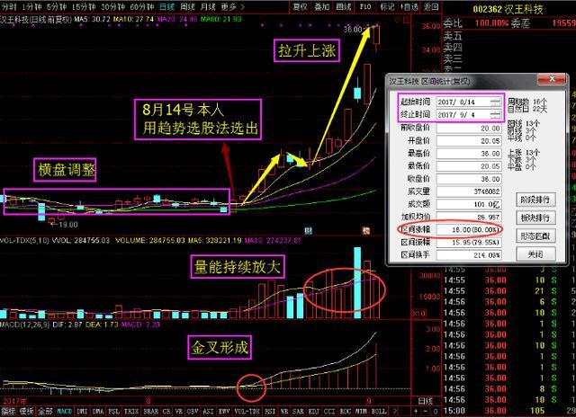 漢王科技002362前期經(jīng)過(guò)了3個(gè)月的橫盤震蕩,雖然股價(jià)沒(méi)有上漲,但是本人看到主力資金卻在偷偷流入,莊家暗中布局,8月14號(hào)本人看到主力吸籌完畢, 趨勢(shì)出現(xiàn)金叉,當(dāng)天就在專欄用方法選出了漢王科技這只股票,14號(hào)那天有幸看到了高姐內(nèi)參專欄的朋友都做出了選擇,果不其然漢王科技開(kāi)始一路高漲,周五又是一個(gè)漲停,截止目前15個(gè)周期漲幅達(dá)到了63%。