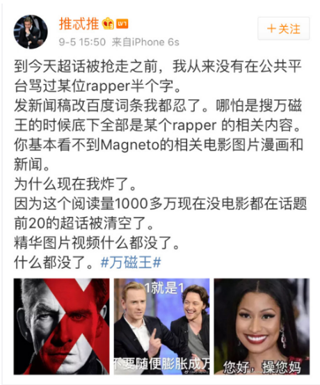 然而近日,有漫威粉絲發現PG ONE的粉絲成為了“萬磁王”(漫威角色)超級話題的主持人,該主持人和PG One互關,成為主持人后還將話題里與漫威角色萬磁王的相關微博刪除,引漫威粉絲不滿。