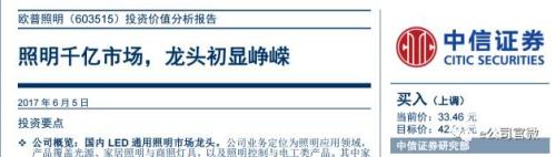 實(shí)際上,早在今年6月5日,中信證券就推出了一份關(guān)于歐普照明的深度報(bào)告,標(biāo)題為《照明千億市場(chǎng),龍頭初顯崢嶸》。