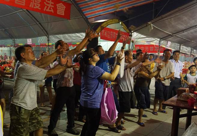 晚間八點多功德圓滿,普銓法師將加持過的念珠,灑向會場,信眾爭相撿拾。(萬和宮提供)