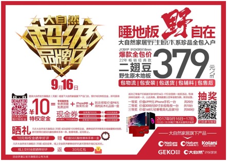 據(jù)悉,9月16日,大自然家居將聯(lián)手天貓平臺,拉開“超級品牌日”特大型促銷活動(dòng)的序幕。線上線下全面推廣,未經(jīng)開啟便引爆社會各界廣泛的關(guān)注度。
