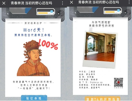 什么考卷還說(shuō)的神乎其神?就是所謂的H5野性測(cè)試——5秒鐘測(cè)試你的狂野指數(shù)。不得不說(shuō)大自然家居這次獨(dú)具匠心,竟然想到用測(cè)試的方式來(lái)呼喚人們被消磨的所剩無(wú)幾的沖動(dòng)、野心!筆者也只是暗搓搓的試了一下,原來(lái)在古代是帝王命格!能夠承載這種稱(chēng)霸天下的野心的地板竟然是野生原木二翅豆。