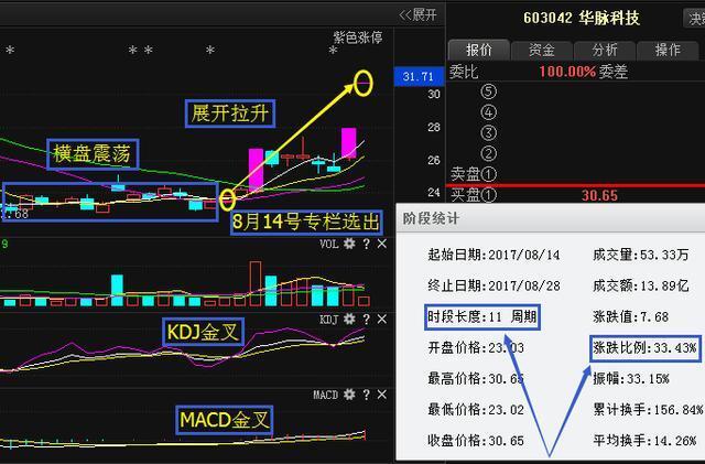 \u00A0 \u00A0 \u00A0 \u00A0我們?cè)賮?lái)看華脈科技603042,該股是本人在8月14號(hào)當(dāng)天根據(jù)三步抓妖戰(zhàn)法選出并給粉絲朋友們發(fā)文講解的,大家可以看到該股前期股價(jià)經(jīng)歷了一波橫盤(pán)震蕩之后,在8月14號(hào)當(dāng)天MACD和KDJ形成金叉買(mǎi)入信號(hào),于是本人果斷給大家發(fā)文講解該股,自本人講解完之后股價(jià)展開(kāi)拉升,截止到目前漲幅33個(gè)點(diǎn)之余。蘇雨私人微信【jz58582】或者QQ【3107881500】