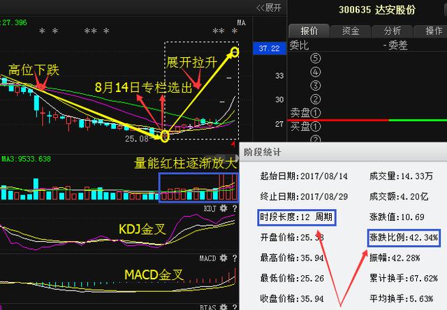 \u00A0 \u00A0 \u00A0 \u00A0我們首先來(lái)看達(dá)安股份300635,該股股價(jià)前期從高位下跌,跌至底部在8月14號(hào)當(dāng)天股價(jià)形成企穩(wěn)信號(hào),MACD和KDJ形成金叉買(mǎi)入信號(hào),本人看到之后果斷給大家選出,選出之后量能紅柱逐漸放大,股價(jià)展開(kāi)拉升,自本人選出講解完之后截止到目前漲幅42個(gè)點(diǎn)之余。蘇雨私人微信【jz58582】或者QQ【3107881500】