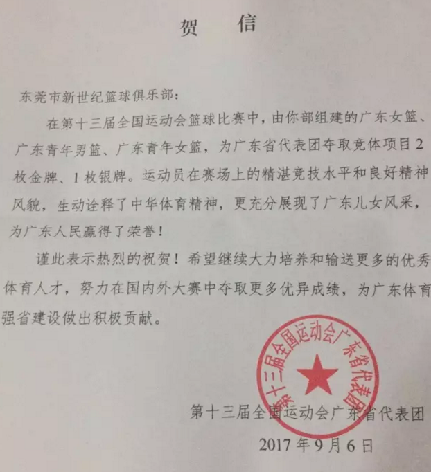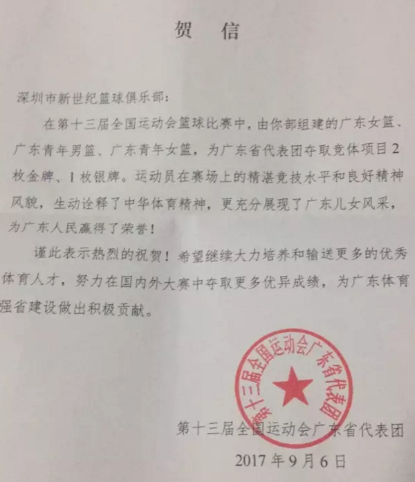 隨著廣東女籃比賽的結(jié)束,新世紀(jì)籃球俱樂(lè)部負(fù)責(zé)的廣東女籃,廣東女青,以及以新世紀(jì)球員和教練組為班底的廣東男青用兩冠一亞的成績(jī)結(jié)束了本屆全運(yùn)會(huì)的征程。隨后本屆全運(yùn)會(huì)廣東省代表團(tuán)為俱樂(lè)部發(fā)來(lái)了賀信!