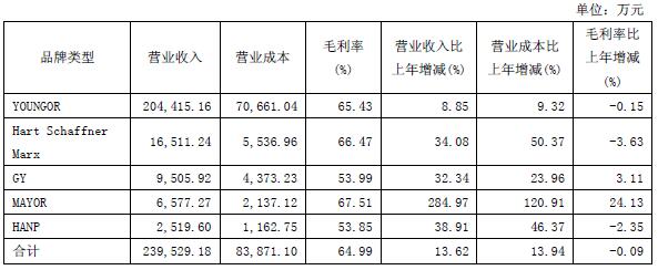 雅戈?duì)柶放品b實(shí)現(xiàn)營(yíng)業(yè)收入239,529.18萬(wàn)元,較上年同期增長(zhǎng)13.62%,其中:主品牌Youngor實(shí)現(xiàn)營(yíng)業(yè)收入204,415.16萬(wàn)元,較上年同期增長(zhǎng)8.85%;子品牌MAYOR\u00A0、Hart Schaffner Marx等合計(jì)實(shí)現(xiàn)營(yíng)業(yè)收入35,114.02萬(wàn)元,銷售占比較上年同期提高3.74個(gè)百分點(diǎn)至14.66%;在MAYOR爆發(fā)性增長(zhǎng)284.97%的拉動(dòng)下,增速較上年同期大幅增加43.88個(gè)百分點(diǎn)至52.54%。
