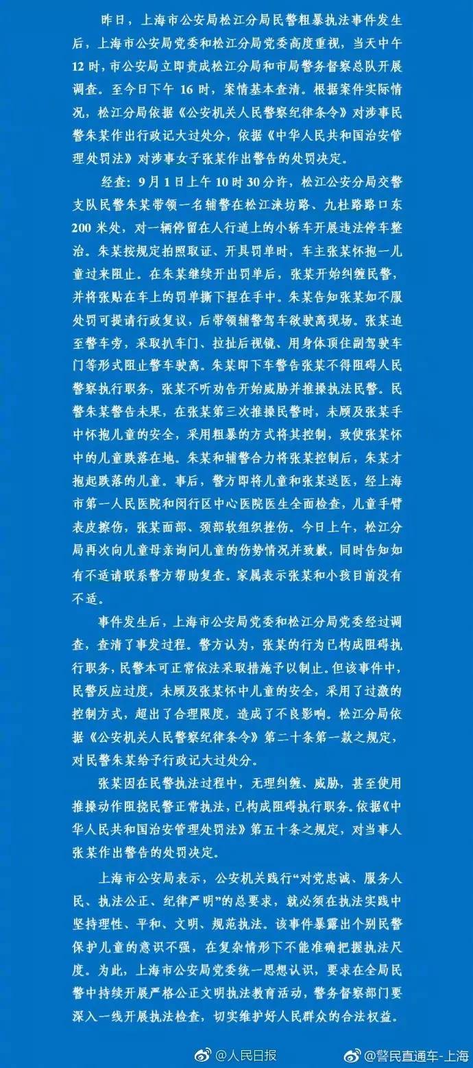 上海市公安局昨晚通報(bào):因民警超出合理的控制限度,松江分局對(duì)涉事民警朱某作出行政記大過(guò)處分;涉事女子張某無(wú)理糾纏、威脅,甚至推搡阻撓民警正常執(zhí)法,已構(gòu)成阻礙執(zhí)行職務(wù),對(duì)張某作出警告的處罰決定。(@人民日?qǐng)?bào))