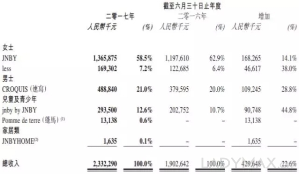包括JNBY和less兩個(gè)品牌在內(nèi)的女裝部門銷售額同比增長15.9%至15.3億元,占整體銷售額的65.6%;