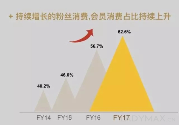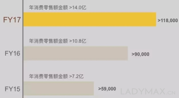 在2017財(cái)年,會員所貢獻(xiàn)的零售額占零售總額的62.6%,集團(tuán)的活躍會員賬戶數(shù)目已超過26萬個(gè)(2016財(cái)年是19萬個(gè)),2017財(cái)年購買總額超過人民幣5000元的會員賬戶數(shù)目超過11.8萬個(gè),其消費(fèi)零售額也達(dá)到人民幣14億元。