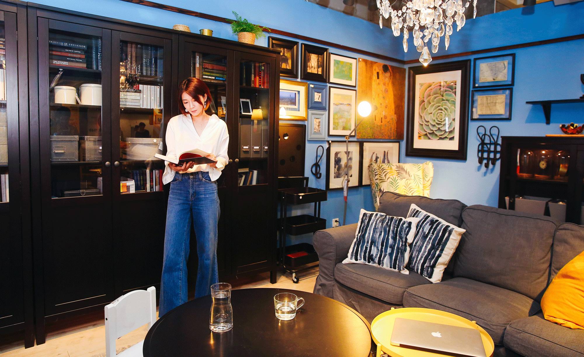 米老師拍攝的第一間展間是一個冷色調風格的客廳,它用了飽和度很高的藍色墻面,搭配全套黑色家具,帶些復古的調調。