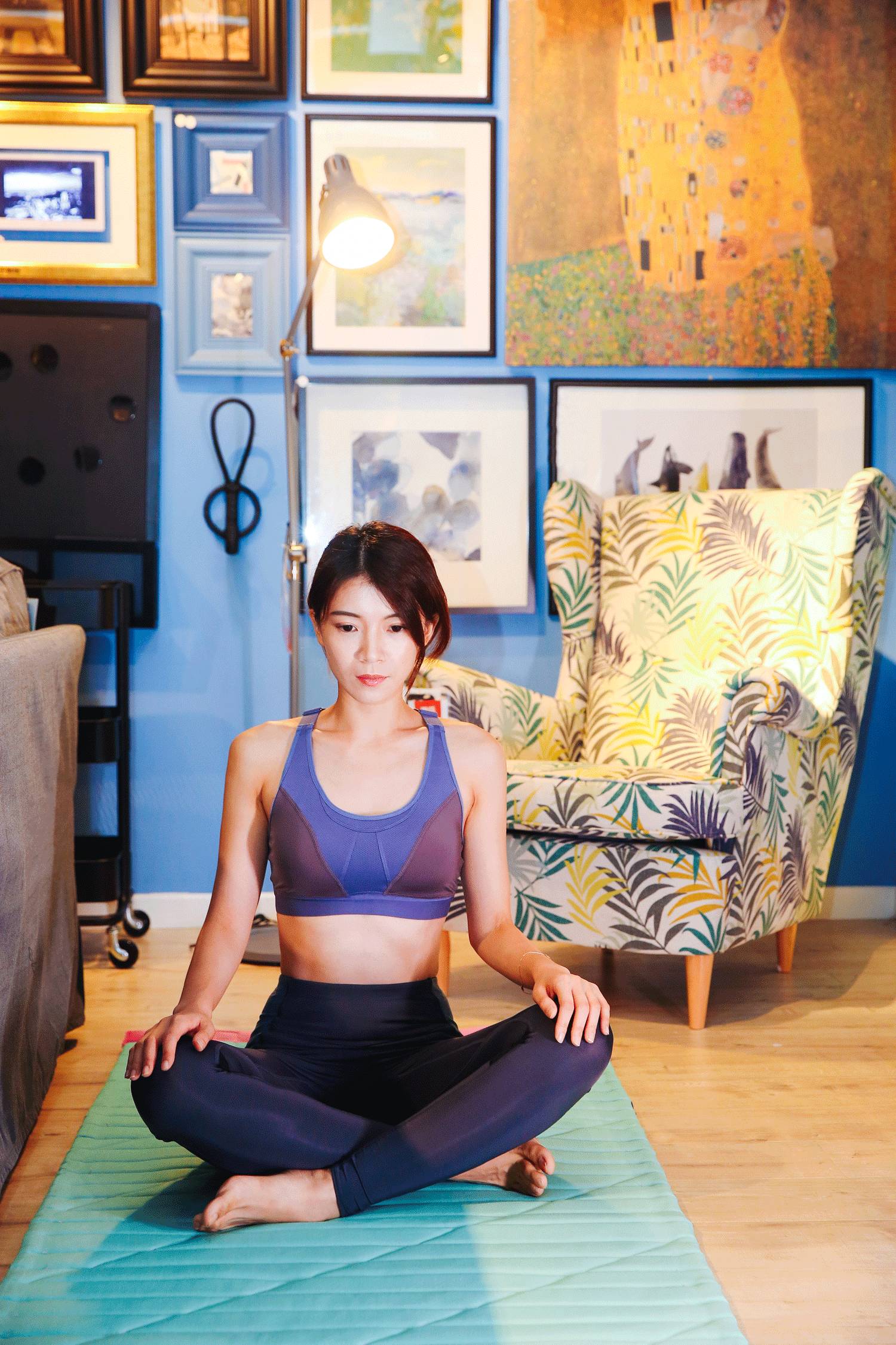 還是在剛剛的那個客廳,就在沙發背后,鋪開一張瑜伽毯,換上Particle Fever健身服,打開Keep,兩平方米的地方就可以成為一個自己的健身區域,平常米老師在家也就是這么健身的!