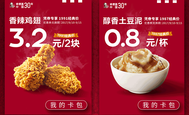 古人講:”三十而立”。為了慶祝進(jìn)入中國(guó)30周年這一里程碑,肯德基宣布在9月10日至15日期間推出第二輪“經(jīng)典滋味,價(jià)格重回當(dāng)年”活動(dòng),所有肯德基WOW會(huì)員屆時(shí)將有機(jī)會(huì)以當(dāng)年的價(jià)格購(gòu)買(mǎi)活動(dòng)限定產(chǎn)品。肯德基WOW會(huì)員將收到電子優(yōu)惠券,以人民幣0.8元購(gòu)買(mǎi)經(jīng)典土豆泥、3.2元購(gòu)買(mǎi)招牌香辣雞翅—這分別是1987年和1991年這兩款產(chǎn)品推出時(shí)的價(jià)格。