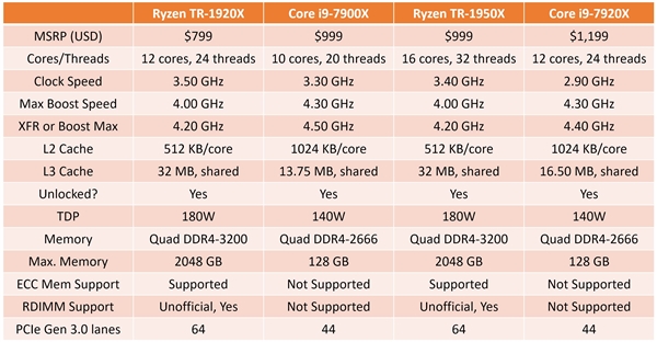 相比于i9-7900X,它多了2核心4線程,基準頻率降低了400MHz,最高加速頻率也低了100MHz,而內存、PCI-E、熱設計功耗都保持一致。