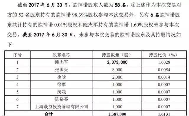 根據(jù)帝王潔具的收購公告顯示,截至2017年6月30日,除了參與本次股權(quán)交易的98.39%股權(quán)外,還有7名小股東持有歐神諾1.61%股權(quán),其中歐神諾前實際控制人鮑杰軍持有237.3萬股,持股比例為1.60%;剩余6名小股東持有0.01%股權(quán),合計1.4萬股。