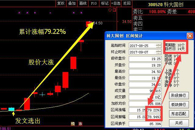 科大國創前期股價除權之后,開始連續的震蕩調整,股價回踩底部支撐,再次受主力的青睞,在底部走出了一波震蕩吸籌的走勢,吸足籌碼后8月25號主力再次大跌洗盤清洗浮碼,相信本人朋友圈的粉絲當時也是明白了主力的意圖,及時把握住科大國創這票的短期機會,截止到目前漲幅也是高達79.22%,大家把握住這樣走勢的個股是不是輕輕松松呢?