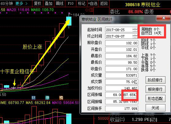 寒銳鈷業(300618),支撐點位出現十字星企穩信號選出,截止目前8個交易日的時間漲幅67.65%。一直是朋友圈的粉絲朋友也是抓到了這2只股票的漲幅收益。試想一下,如果你也一直是我朋友圈的粉絲朋友,并且有幸看到了本人用這種思路選出來講解的這2只股票,及時布局介入,那么這短短8個交易日的時間近68個點的漲幅收益是不是同樣可以收獲?