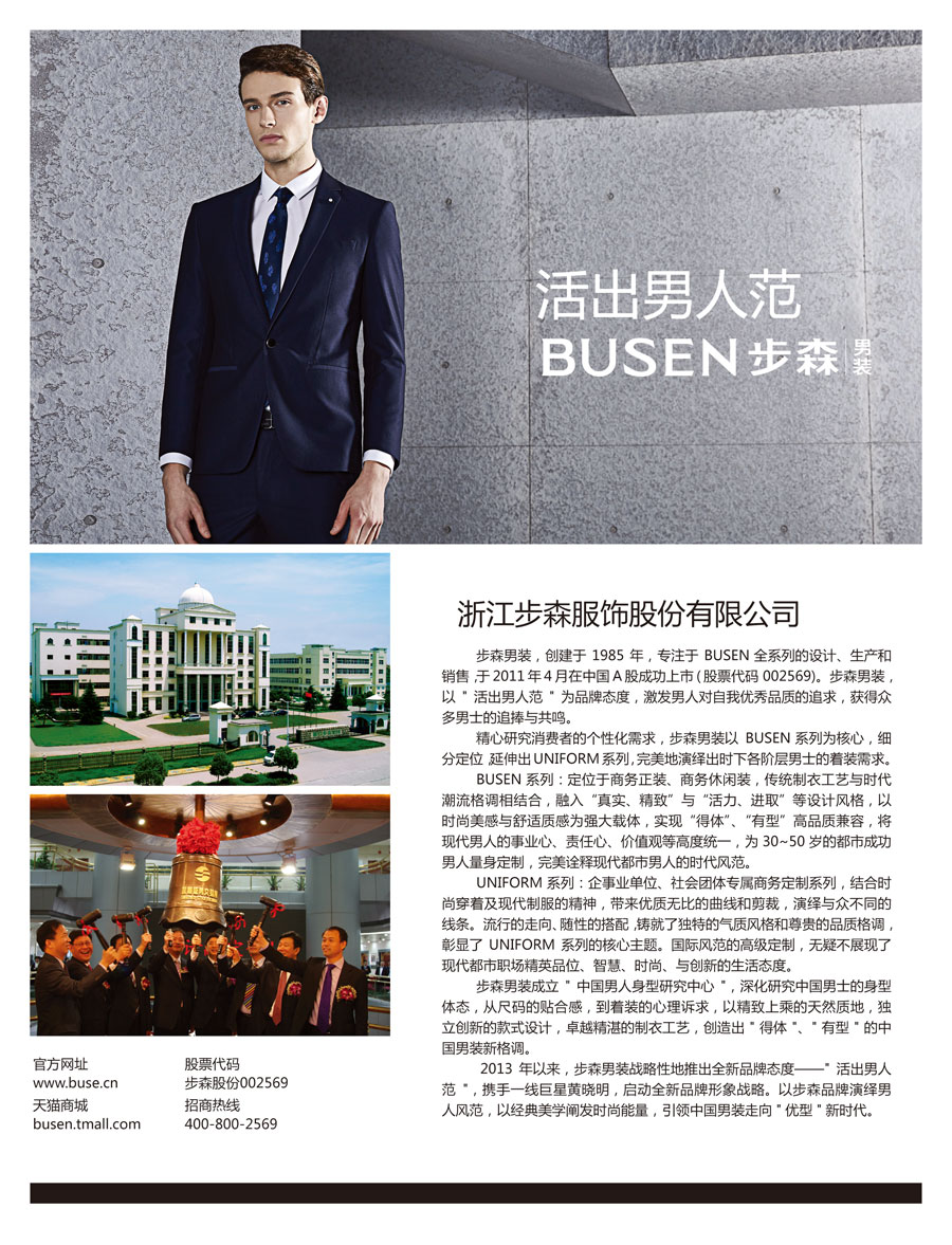 全國“質(zhì)量月”活動是我國長期開展的一項重大質(zhì)量活動。我國“質(zhì)量月”活動是在政府部門的倡導(dǎo)和部署下,以多種形式于每年的9月在全國范圍內(nèi)動員全社會尤其是廣大企業(yè)積極參與,組織開展并旨在提高全民質(zhì)量意識,營造人人關(guān)心質(zhì)量、重視質(zhì)量、創(chuàng)造質(zhì)量、享受質(zhì)量的良好社會氛圍,提升國家質(zhì)量競爭力的群眾性主題活動。 首頁 > 質(zhì)量月 > 2017年全國質(zhì)量月企業(yè)展示 > 浙江省 > 浙江步森服飾股份有限公司 http://www.busen.cn 主要產(chǎn)品:BUSEN襯衫、西服、褲子 全國“質(zhì)量月”活動專用標(biāo)識 “全國質(zhì)檢穩(wěn)定合格產(chǎn)品”專用標(biāo)識 “3.15”活動專用標(biāo)識 中國質(zhì)量檢驗協(xié)會企業(yè)團(tuán)體會員專用標(biāo)識