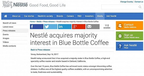 雀巢公司表示,藍(lán)瓶咖啡仍將維持獨(dú)立運(yùn)營,同時其產(chǎn)品能通過雀巢咖啡現(xiàn)有的口碑和消費(fèi)網(wǎng)絡(luò)將觸手伸向廣闊市場。
