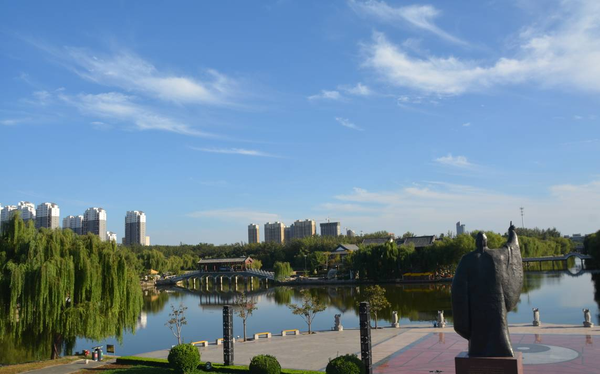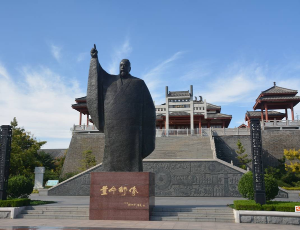 湛藍(lán)的天空,配上董子園,更有一種“曲徑通幽處”的美。董子文化街位于德州市經(jīng)濟(jì)開發(fā)區(qū),雙層的仿古建筑檐牙交錯(cuò),園區(qū)設(shè)計(jì)可謂曲徑通幽,穿過一條條書法、文物、雕刻的交易長廊后,一片清澈的湖水出現(xiàn)在人們面前。湖岸聳立著一座由當(dāng)代著名雕塑大師錢紹武銅鑄的董仲舒雕像。雕像背后是董子讀書臺,拾階而上,猶如走進(jìn)大漢殿堂,氣勢恢宏,盡顯大漢雄風(fēng)。