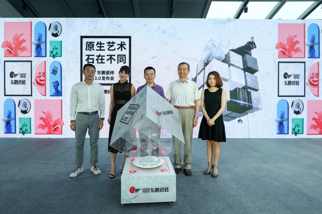 \u00A0\u00A0\u00A0\u00A0東鵬瓷磚高層與陳燃以及中國建筑衛(wèi)生陶瓷協(xié)會會長葉向陽共同發(fā)布東鵬原石3.0系列