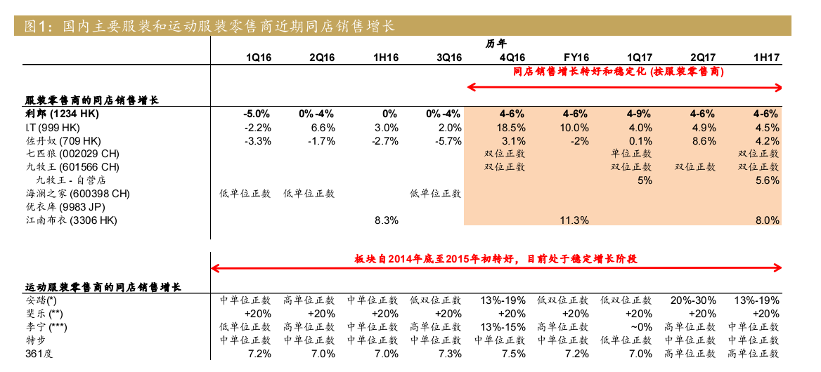 近日招商證券發(fā)布研究報(bào)告,指出其定性和定量渠道調(diào)研都顯示,服裝板塊從2016年底到2017年初已經(jīng)出現(xiàn)好轉(zhuǎn),目前已經(jīng)恢復(fù)穩(wěn)定增長。而中國運(yùn)動(dòng)服裝板塊從2014年底出現(xiàn)好轉(zhuǎn),從2015年起開始恢復(fù)健康增長。