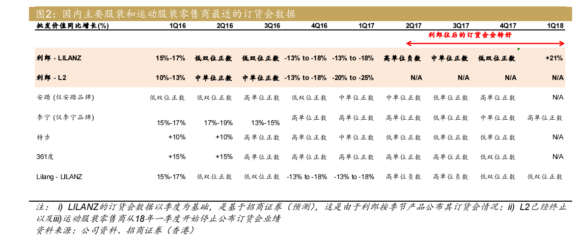 \u00A0另外,由于同店銷售增長穩(wěn)健,經(jīng)銷商正在補(bǔ)充庫存(圖2)。服裝和運(yùn)動(dòng)服裝同業(yè)的訂貨會(huì)前瞻比較也顯示服裝板塊的營收將在17年下半年和18年度重新實(shí)現(xiàn)高單位數(shù)到雙位數(shù)的健康增長。