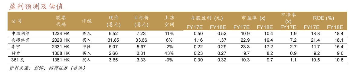招商證券維持有別于市場(chǎng)共識(shí)的買入評(píng)級(jí),新的目標(biāo)價(jià)為7.23港元,反映較高的18/19年度每股盈利預(yù)測(cè)及18年度目標(biāo)預(yù)測(cè)市盈率從10.5倍上調(diào)至11.5倍,基于我們采用服裝行業(yè)平均水平的估值方法保持不變,也符合運(yùn)動(dòng)服務(wù)行業(yè)的平均水平。