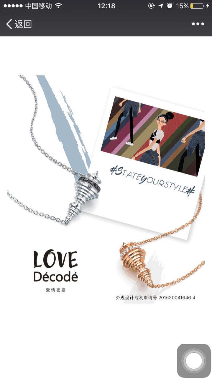 放慢生活節(jié)奏,懶洋洋地曬著太陽(yáng)踱步,是Cassie找尋輕松愉悅的方式。#隨遇而安#,#順其自然#,也是Cassie的愛(ài)情格言。就算遇見(jiàn)真正的Mr. Right,也不高調(diào)秀恩愛(ài),靜靜享受愛(ài)情帶來(lái)的愉快。“我愛(ài)你”三個(gè)字是經(jīng)典卻恒久的愛(ài)情箴言,佩戴Love Décodé「愛(ài)情密語(yǔ)」系列18K黃金鉆石聲波項(xiàng)鏈1Love Décodé「愛(ài)情密語(yǔ)」系列18K黃金鉆石項(xiàng)鏈,以聲音為主題,捕捉「我愛(ài)你」獨(dú)特的聲波輪廓,透過(guò)最經(jīng)典但從不過(guò)時(shí)的三個(gè)字,含蓄表白愛(ài)意。外觀設(shè)計(jì)專利申請(qǐng)?zhí)?01630041646.4