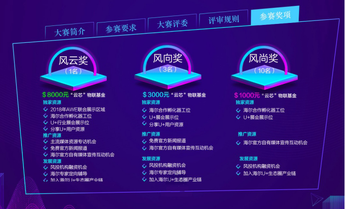 本屆海爾U+創(chuàng)客大賽將為參賽家具企業(yè)提供包括五大優(yōu)勢資源支撐:“20萬物聯(lián)云創(chuàng)業(yè)基金”、“免費(fèi)提供海爾U+軟硬件一體物聯(lián)云解決方案”、“優(yōu)先接入海爾U+生態(tài)”、“國際專家指導(dǎo)”、“一流孵化器平臺支持”,以及設(shè)風(fēng)云獎(jiǎng)1名,獎(jiǎng)金8000美元;風(fēng)向獎(jiǎng)3名,獎(jiǎng)金3000美元;風(fēng)尚獎(jiǎng)10名,獎(jiǎng)金1000美元的物質(zhì)獎(jiǎng)勵(lì)。成功晉級企業(yè)的智能家具、家裝產(chǎn)品也將融入海爾U+廚房、浴室、起居、娛樂、安防等大智慧生態(tài)圈搭建的全場景智能生態(tài)系統(tǒng),成為豐富家居家裝子場景的有生力量。