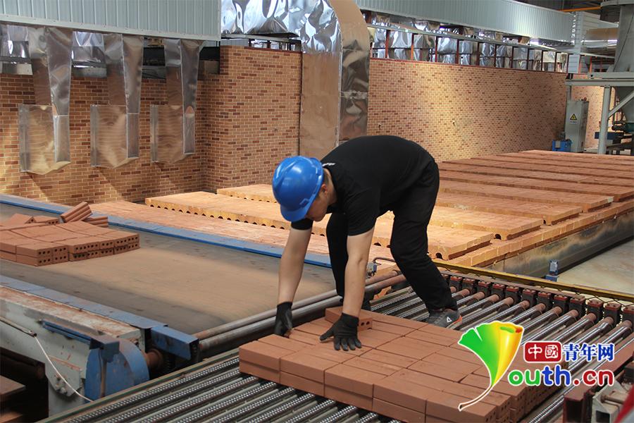 薩日娜將干燥好的磚放到窯車上送往隧道窯進行焙燒。中國青年網記者謝東櫻攝