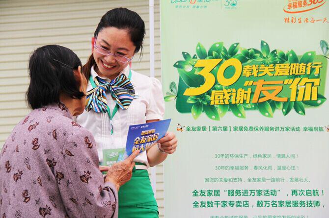 三十一年的發(fā)展歷程,全友家居一直堅(jiān)持用感恩與赤子情懷回饋每一位客戶。1986-2002年,全友家居將服務(wù)進(jìn)行統(tǒng)一規(guī)范管理,拉開(kāi)了打造規(guī)范化服務(wù)體系的序幕;2002-2007年,全友家居致力于解決顧客售后問(wèn)題和建立終端售后服務(wù)渠道;2008-2013年,全友家居正式將“365服務(wù)”全面升級(jí)為“幸福服務(wù)365”服務(wù)品牌,并在全國(guó)范圍內(nèi)開(kāi)展了免費(fèi)家具保養(yǎng)活動(dòng)—— “服務(wù)進(jìn)萬(wàn)家”;從2014年至今,全友家居以售后服務(wù)作為發(fā)力點(diǎn),持續(xù)推進(jìn)免費(fèi)家具保養(yǎng)活動(dòng)——“服務(wù)進(jìn)萬(wàn)家”,推出免費(fèi)保養(yǎng)保潔服務(wù)活動(dòng)“U愛(ài)家”等一系列服務(wù)舉措,全方位提升了“幸福服務(wù)365”服務(wù)品牌內(nèi)涵和活力。