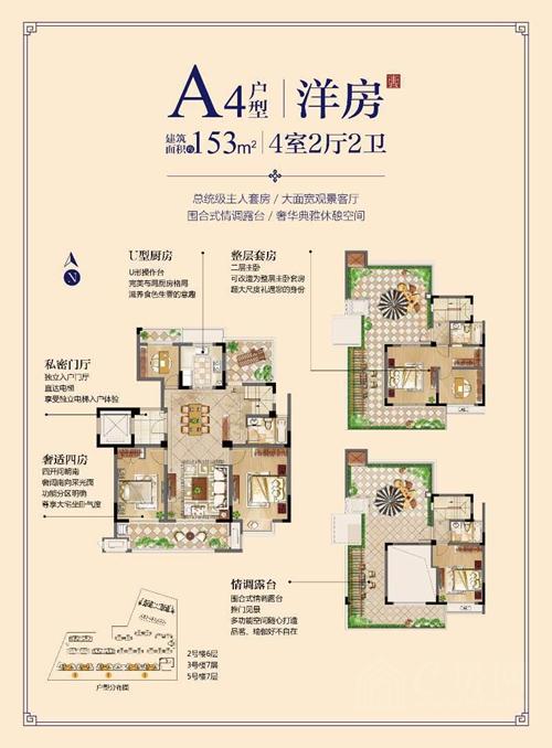 ·頂層(2#6層,3#、5#7層)4室2廳2衛(wèi),153平。私立入戶(hù)門(mén)廳直達(dá)電梯,二層主臥可改造為整層主臥套房,尊享大宅坐臥氣度。