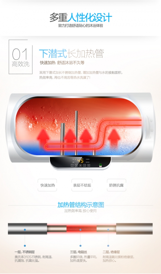就美的(Midea)F60-15WB5(Y)電熱水器的配置來(lái)說(shuō),也十分考究。它采用藍(lán)鉆內(nèi)膽,可防水垢、防腐蝕、抗壓防爆、耐磨且耐用。而整體發(fā)泡技術(shù),則能使整個(gè)內(nèi)膽嚴(yán)密沒(méi)有縫隙,令它的保溫效果技高一籌。此外,該款產(chǎn)品使用的是下潛式長(zhǎng)加熱管,令加熱管與水接觸面積增大,相同的時(shí)間比其他產(chǎn)品擁有更高的熱效率,縮短等待時(shí)間。