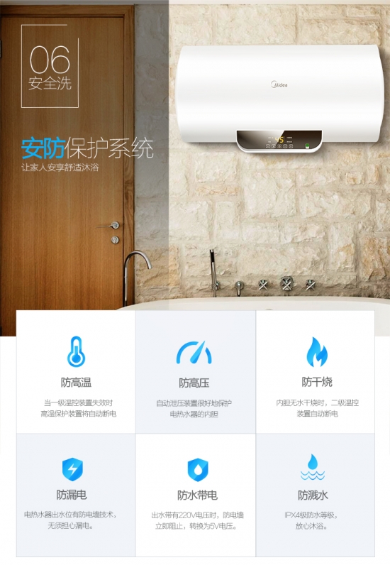 使用電熱水器還有些安全問(wèn)題經(jīng)常讓用戶擔(dān)憂,如干燒、漏電等等。美的(Midea)F60-15WB5(Y)電熱水器,巧妙地規(guī)避了這些“BUG”。它搭載了高溫保護(hù)裝置,溫度過(guò)高時(shí)會(huì)自動(dòng)斷電,此外還有諸如防高壓和干燒的裝置。在防漏電方面,它同樣也很出色,防電墻技術(shù)讓用戶無(wú)須擔(dān)心漏電,當(dāng)出水帶電時(shí)防電墻會(huì)立即阻止,轉(zhuǎn)換為5V電壓。