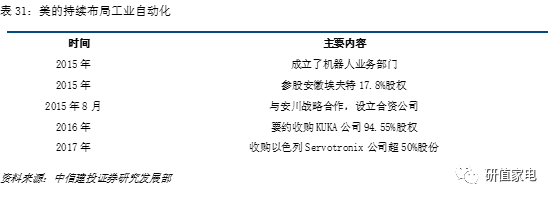 家電行業(yè)整體收入增速平緩,效率提升是利潤(rùn)水平提升的關(guān)鍵手段。自 2012 年以來(lái),美的集團(tuán)累計(jì)投入使用近千臺(tái)機(jī)器人,自動(dòng)化改造預(yù)計(jì)投入約 50 億元,美的集團(tuán)廣州及武漢空調(diào)全智能工廠,以設(shè)備自動(dòng)化、生產(chǎn)透明化、物流智能化、管理移動(dòng)化與決策數(shù)據(jù)化,實(shí)現(xiàn)訂單、供應(yīng)、 研發(fā)、生產(chǎn)、乃至配送全過(guò)程時(shí)時(shí)監(jiān)控,大幅提高了生產(chǎn)的自動(dòng)化率。工業(yè)自動(dòng)化符合公司智能制造的戰(zhàn)略布局,公司自15年來(lái)以并購(gòu)和對(duì)外投資方式逐步完善機(jī)器人產(chǎn)業(yè)布局。
