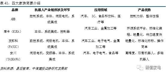 四大家族均是先掌握了機(jī)器人本體和機(jī)器人某種核心零部件的技術(shù),最終實(shí)現(xiàn)一體化發(fā)展,成為全球領(lǐng)先的工業(yè)自動(dòng)化企業(yè)的。如ABB 和安川電機(jī)從事電力設(shè)備電機(jī)業(yè)務(wù)、發(fā)那科從事數(shù)控系統(tǒng)業(yè)務(wù),庫(kù)卡一開(kāi)始則從事焊接設(shè)備業(yè)務(wù)。