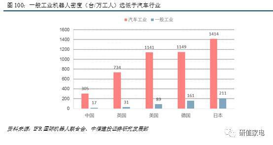 2015年我國(guó)汽車(chē)行業(yè)產(chǎn)值約為6.6萬(wàn)億,而單單就電子信息制造業(yè)產(chǎn)值約11.3萬(wàn)億,遠(yuǎn)超汽車(chē)行業(yè)。再加上其他的制造業(yè),一般工業(yè)發(fā)展空間非常大。2015年我國(guó)工業(yè)機(jī)器人市場(chǎng)規(guī)模為510億元,一般工業(yè)占比64%;若我國(guó)一般工業(yè)機(jī)器人密度達(dá)到100臺(tái)/萬(wàn)人,推算出一般工業(yè)市場(chǎng)規(guī)模可達(dá)1920億元。