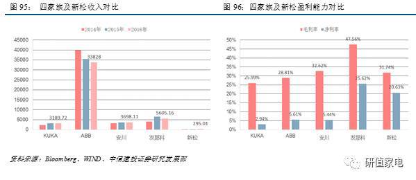 總體而言,無(wú)論是收入規(guī)模或者盈利能力,KUKA與其他三大家比均處于末位。但工業(yè)機(jī)器人領(lǐng)域在國(guó)外已屬成熟行業(yè),除發(fā)那科外,總體凈利率處于個(gè)位數(shù)。新松機(jī)器人得益于國(guó)內(nèi)的行業(yè)景氣和稅收優(yōu)惠,以及其在國(guó)內(nèi)龍頭地位,享有較高凈利率。