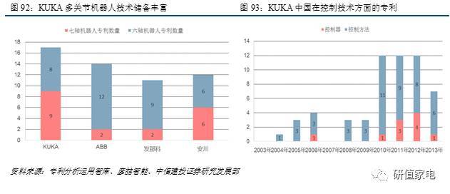 KUKA在決定機(jī)器人性能的控制算法方面優(yōu)勢(shì)明顯,專(zhuān)注于多關(guān)節(jié)類(lèi)高端產(chǎn)品,相比之下,國(guó)內(nèi)自動(dòng)化制造仍以坐標(biāo)機(jī)器人為主。即便在四大家族中,KUKA和ABB的運(yùn)動(dòng)控制也是比發(fā)那科和安川做得好的。從產(chǎn)品價(jià)格上就可見(jiàn)一斑,安川本體售價(jià)3500-6000英鎊,KUKA本體售價(jià)5500-17500英鎊。另外,從專(zhuān)利上看,KUKA在六、七軸等高端機(jī)器人部分技術(shù)儲(chǔ)備豐富,入華后控制技術(shù)專(zhuān)利不斷。