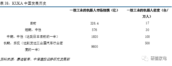 中國(guó)作為世界工廠,承接了發(fā)達(dá)國(guó)家的制造業(yè)轉(zhuǎn)移,是機(jī)器人的最大需求方。KUKA想要擴(kuò)大中國(guó)銷(xiāo)售,擴(kuò)大在華競(jìng)爭(zhēng)力和影響力,需要提出符合當(dāng)?shù)匦枨蟮谋就粱a(chǎn)品,美的集團(tuán)能夠給予不少幫助。另外,美的集團(tuán)作為中國(guó)白電龍頭,自身有很大的自動(dòng)化需求,再加上美的的客戶(hù)及供應(yīng)商網(wǎng)絡(luò),將為KUKA 中國(guó)市場(chǎng)拓展插上翅膀。
